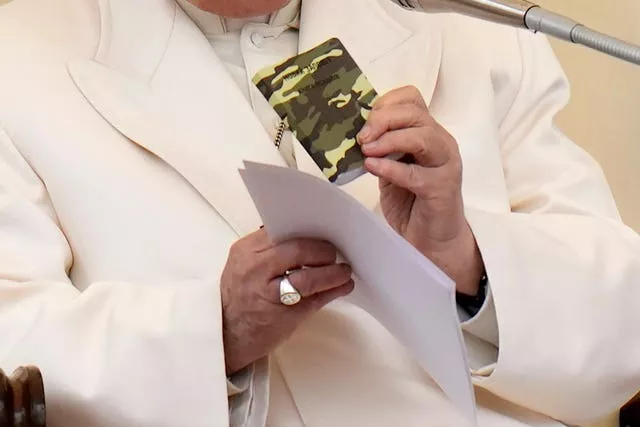 At the end of his general audience, Francis also showed tourists and pilgrims in St Peter’s Square the rosary and camouflaged New Testament book that a 23-year-old Ukrainian soldier named Oleksandre had with him when he was killed in the eastern city of Avdijevka.