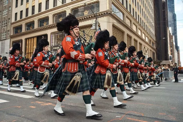 Bagpipers march along Fifth Avenue during the St Patrick’s Day