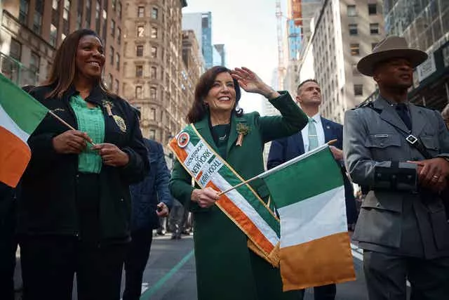 Attorney General of New York, Letitia James (left) and New York Governor Kathy Hochul, march during the city parade